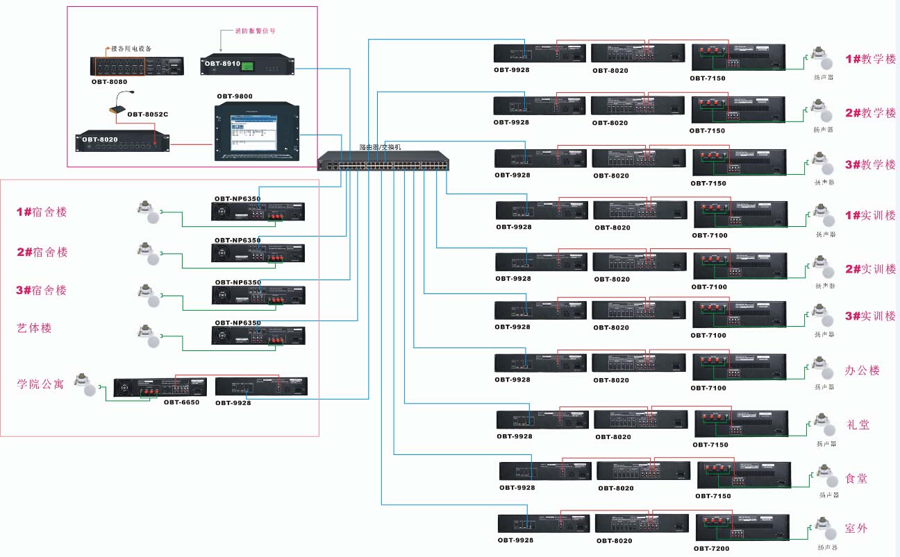 2、專家樓、候診樓、行政樓、住院部、室外園區等區域布置背景音樂喇叭,廣播系統利用IP網絡可實現手動自動播放背景音樂或尋呼廣播;